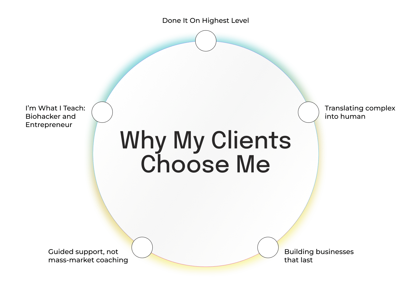 With me, you’re not a number in a community of thousands. My programs: from Digital Business Incubation to Coaching High-Performers, are personalized. You’ll get individual analysis, feedback and tailored strategies so you always know exactly what your next steps are. My clients don’t “buy a course”. They get me as a partner in their growth.