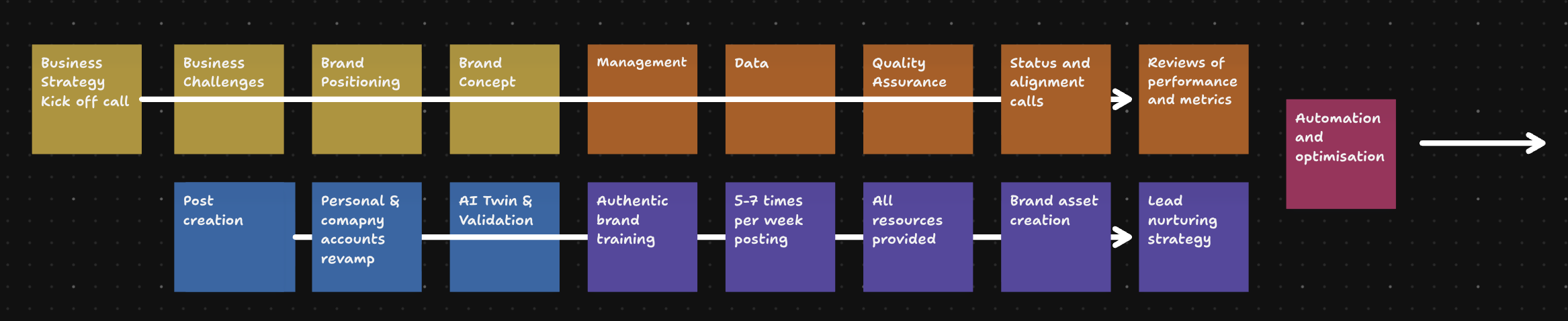 - The first two weeks are about content creation, nailing the brand colors, shapes, banners and revamp of your LinkedIn profiles