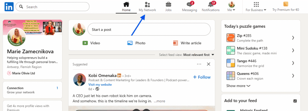 Begin by clicking the My Network icon at the top of your LinkedIn homepage.