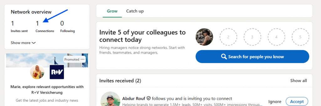 Under your profile name, you will see a link showing your total number of connections, such as “465 connections.” Click that link to open your Connections page.