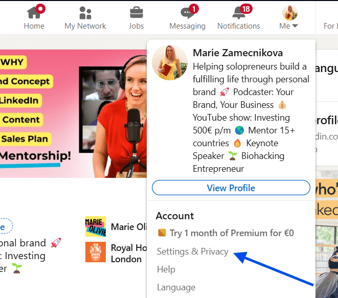 Start by clicking the Me icon at the top of your LinkedIn homepage. Next, select Settings & Privacy from the dropdown menu.