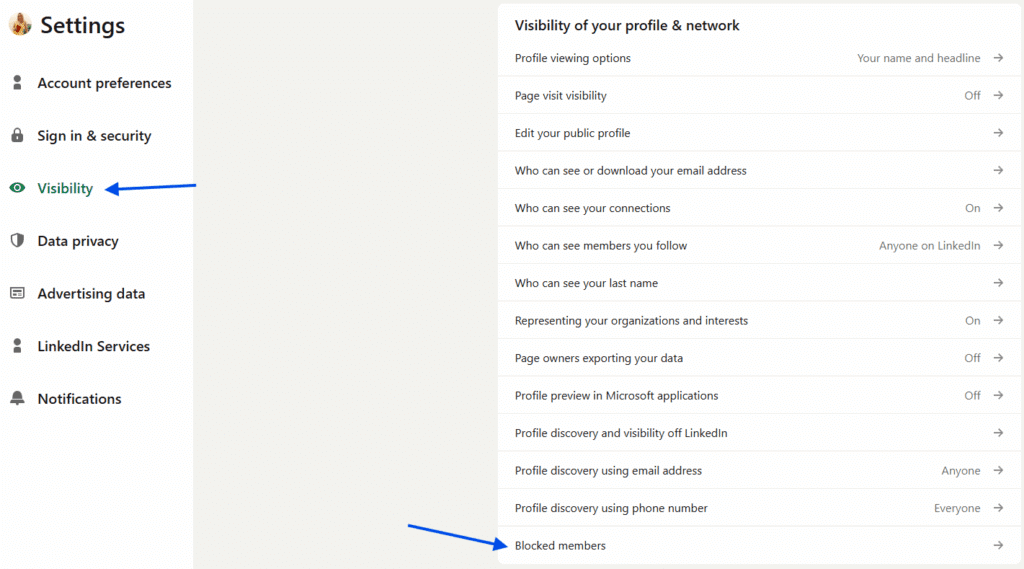 Once inside settings, go to the Visibility section. Under Visibility of your profile & network, you will see an option labeled Blocked members.