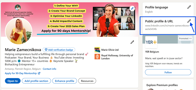 To edit it, go to the “Public profile & URL” section. There, you’ll see a small pencil icon.