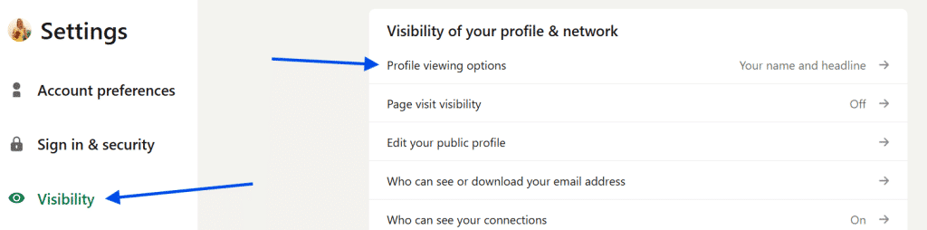 In the menu on the left, click “Visibility,” then choose “Profile viewing options.”