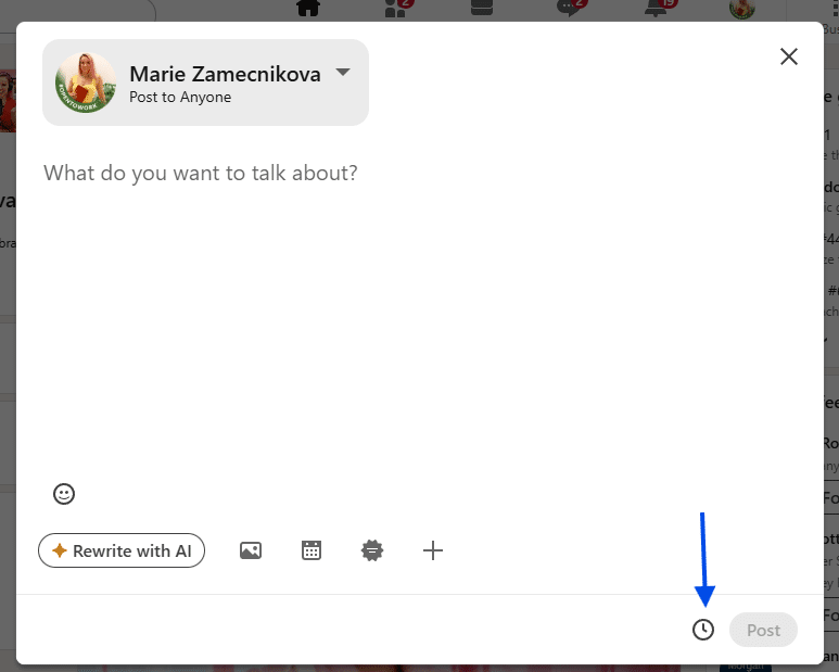 After clicking Create post, a post editor window opens. Now look closely at the bottom right corner of this window. You’ll see a small clock icon. It’s easy to miss if you’re not looking for it. This clock icon is the key to everything. Click it.