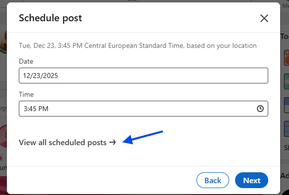LinkedIn doesn’t organize it that way. Everything lives behind the clock icon in the post editor. Once you remember that, the process feels obvious.