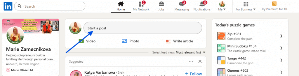 Once you’re on your homepage, look for the blue Create post button near the top. Click it, just as if you were about to publish a new post. This step is important. Many users assume scheduled posts live in analytics or settings. They don’t. They’re tied to the post creation flow.