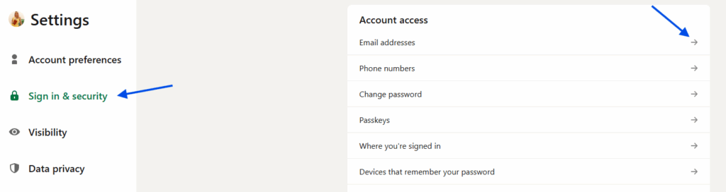 Open email addresses: Click Email addresses. Here, you’ll see all the email addresses currently linked to your account and which one is marked as primary.
