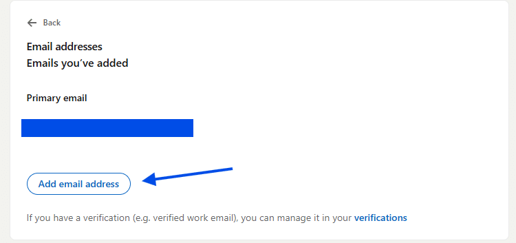 Add a new email address: Click Add email address. LinkedIn may ask you to enter a verification code that’s sent to your current primary email, or it may ask you to approve the action through the LinkedIn app. This step is for security and helps prevent unauthorized changes.