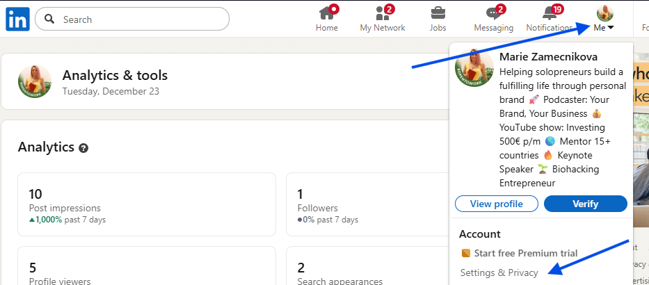 First, click your profile photo at the top of your LinkedIn homepage. From the menu, select Settings & Privacy.