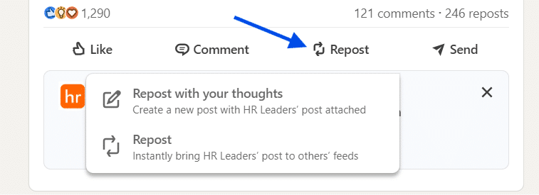 The “Repost” option allows you to share the original post exactly as it is. This is useful when you simply want to pass along content you find valuable without adding commentary.