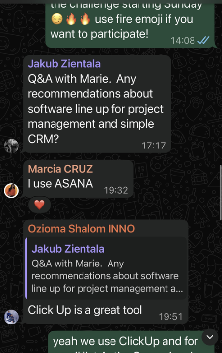 Private WhatsApp Group with 10-20 active entrepreneurs