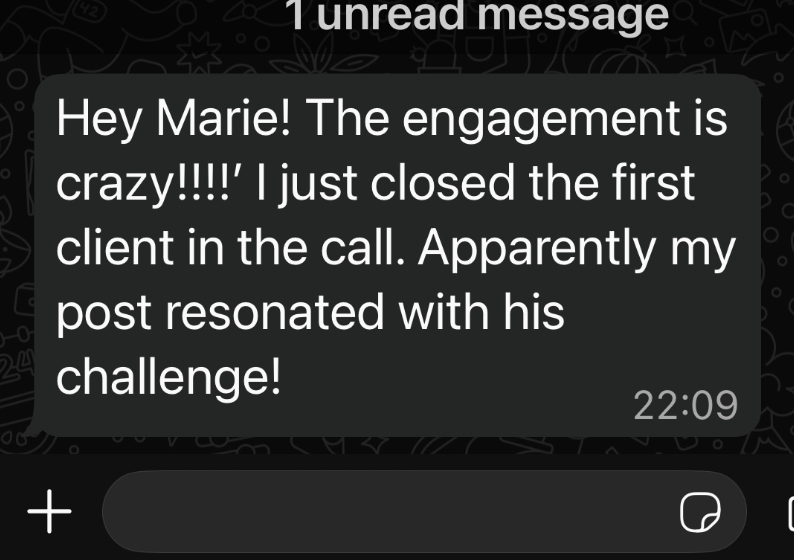 An exclusive, highly selective circle of maximum 20 advanced entrepreneurs — with 3x private coaching sessions, a direct WhatsApp line to Marie, and the complete DBC growth system. Built for founders doing 6-figures+ ARR who are ready to dominate LinkedIn.